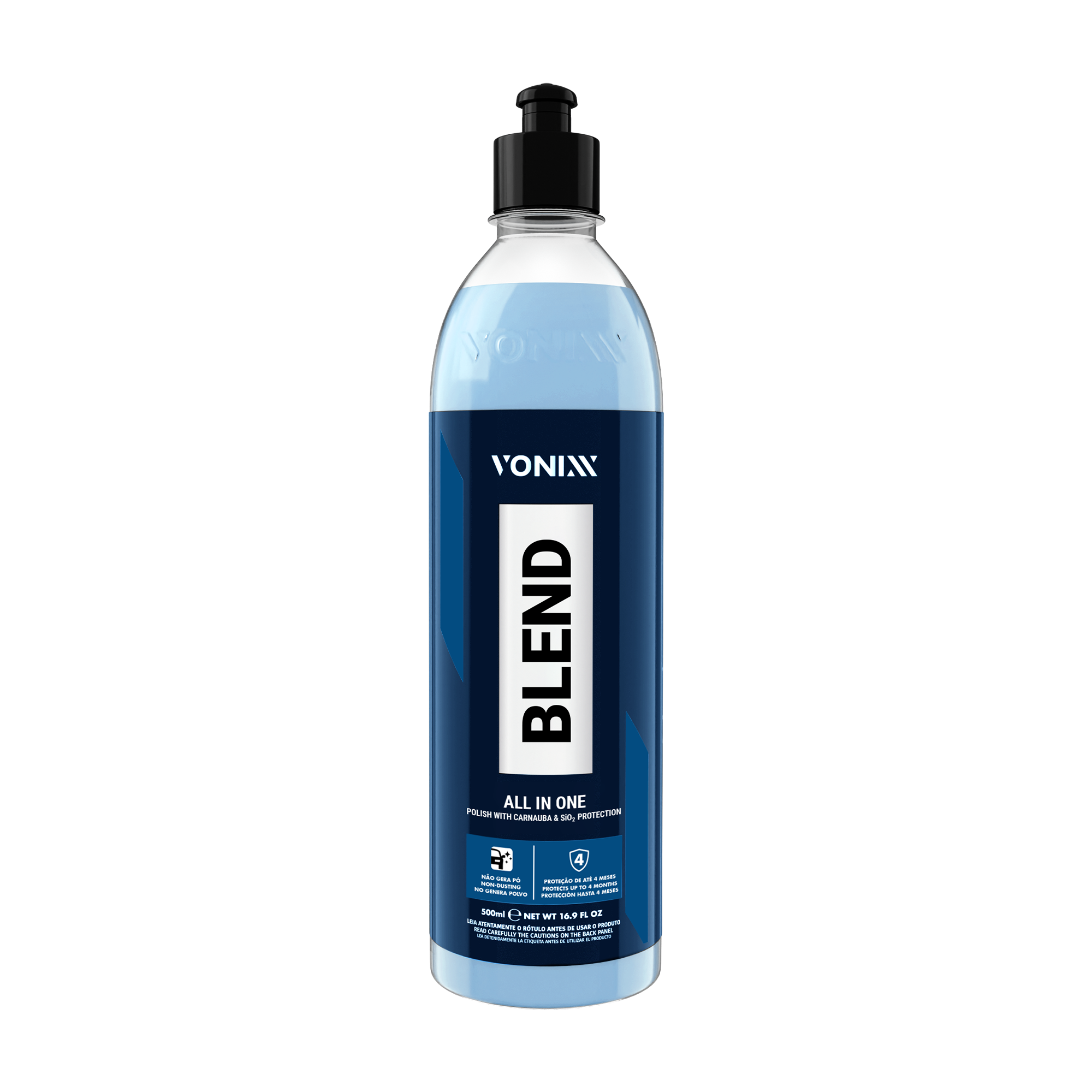 O Blend All In One 500 ml Vonixx é um polidor de etapa única que une polimento, brilho e proteção em uma só aplicação. Ele combina o brilho natural da carnaúba com a resistência cerâmica do SiO₂, oferecendo também hidrorrepelência para a pintura.